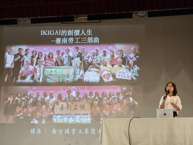 今日講座為臺南做工行善團副團長也是臺南在地知名南方講堂創辦人王美霞,她分享對於做工行善團的觀察與感動。王美霞講座以樸實言語感動全場,提到修繕志工雖默默無聞,卻以汗水守護城市,展現勞工無私精神。她亦分享義剪行動,強調陪伴弱勢、傳遞溫暖的重要。她說:「做工人ㄟ愛,就是用自己的專業做別人的靠山。」