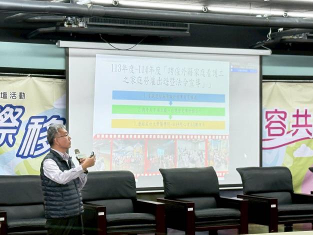 論壇主題涵蓋政策、人權、科技與照護多面向,由國立成功大學社會科學院蔡群立院長擔任主持人,並由成大不同系所教師依序接力分享研究成果。首先由成大法律系葉婉如主任分享,全球供應鏈人權要求及企業面臨的新挑戰,強調合規為競爭力關鍵。接著王靖興教授點出臺灣在留才政策及生活支持面向的改善空間,提供具體政策建議。再由郭佩棻副教授以呈現移工居住環境、交通可及性與生活設施分布的量化研究成果,有助政府精準掌握服務缺口。最後,王禕梵教授探討 AI 技術如何降低照護壓力、提升工作效率。另外,在社福照護領域專長的鍾智慧秘書長,發表集中訓練與到宅指導雙軌模式,說明如何協助看護工提升專業能力並降低家庭照護風險。