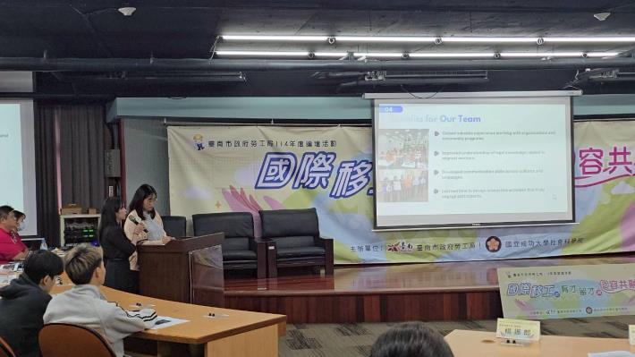 本次活動也展現青年投入移工議題的熱情。研究生曾大縉與蕭友哲分享使用「臺南新照護帶你不阿茲」APP 如何協助降低照護壓力。博士生庫娜妮思娃則藉由活動陪伴,分享對家庭看護工身心健康的觀察。研究生 Pimnara Nuangjamnong 與 Pitsinee Kongkunakul 也藉由實際參與移工健康諮詢服務活動,分享語言協助、跨文化溝通及協力心理支持等實務經驗。