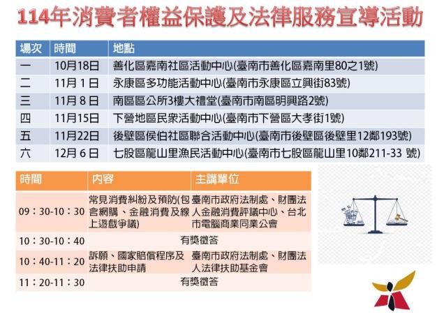 黃偉哲市長致力提昇民眾面對日益多元社會環境的自我保護能力,為有效防堵消費詐騙,提升防詐意識,南市府法制處邀集相關專業機構及民間單位,於本(114)年10月至12月間深入社區辦理「消費者權益保護及法律服務宣導」,歡迎民眾踴躍參加,增加消保及法律常識,保護自身權益。