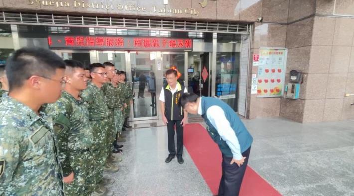 今(13)日上午台南市雖風雨逐漸增強,但各地尚未傳出異狀,而黃偉哲市長一早即來到北門、學甲、將軍區公所視察,聽取區公所報告風災整備情況,同時對於國軍已提早進駐整備以應對可能發生的災情,黃偉哲也深深一鞠躬,表達對國軍弟兄的感謝。