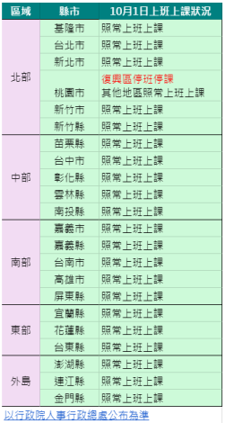 (中央社網站30日電)颱風米塔侵襲台灣,暴風圈今天已進入台灣陸地。中央氣象局預測,颱風米塔的中心將在今天深夜至明天凌晨從台灣東北角沿海通過,北部風雨最強。全台各地10月1日停班停課情形整理如下:
