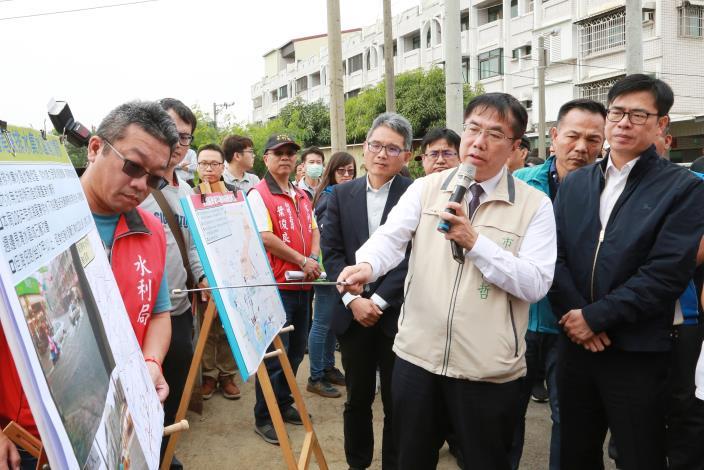 水利局長李賢義簡報說明,為解決海尾寮排水上游段部分地下排水箱涵改建困難,且內水受外水位影響無法重力排出問題,水利局規劃於「安中路二段37巷及海尾寮排水3K+835下游右岸」交接處,利用公兒用地設置「安中抽水站」來控制水位,並透過機械抽排方式增加上游排洪能力,抽水量高達36cms,為安南區抽水量最大的抽水站,概估總經費約4億800萬元,其中用地費約1億200萬元、工程經費約3億600萬元。