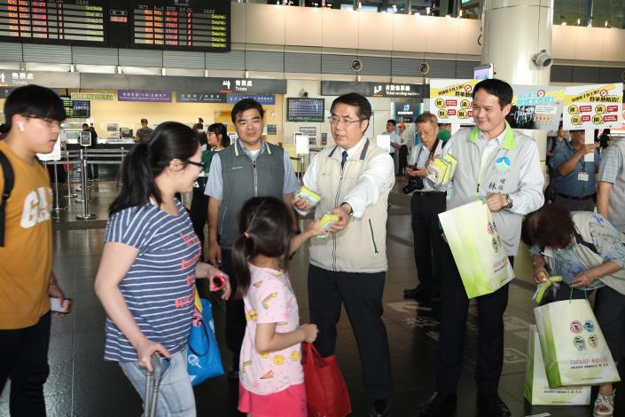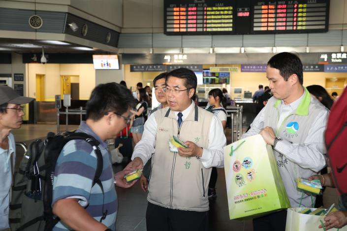 為防範登革熱,黃市長親至高鐵台南站仁發送防疫傳單、菜瓜布及防蚊液等宣導品,呼籲民眾外出及烤肉時應穿著淺色長袖衣褲,身體祼露的部份記得要塗抹衛福部核可的防蚊藥劑,烤肉後也要隨手清理垃圾及空瓶,做好居家戶內外環境孳清,市長表示,中秋佳節外地遊子紛紛返鄉,市府非常歡迎大家回到台南團圓過中秋,目前台南市登革熱疫情已控制得相當不錯,也獲中央疾管署的肯定,但面對登革熱,市府秉持「料敵從寬、禦敵從嚴」,對於防疫工作絕不怠慢,再次提醒各位市民,務必要做好「巡、倒、清、刷」基本功。