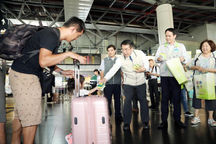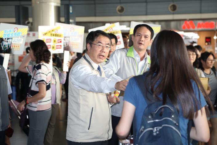 明(13)天就是中秋連假,目前登革熱疫情仍處於流行高峰期,為避免連續假日民眾返鄉或短期渡假,南來北往增加傳染風險,台南市長黃偉哲今(12)日特地前往高鐵台南站進行登革熱防治宣導,請民眾外出時務必做好防範措施,並落實環境「巡、倒、清、刷」,以防堵登革熱傳播,安心過中秋。