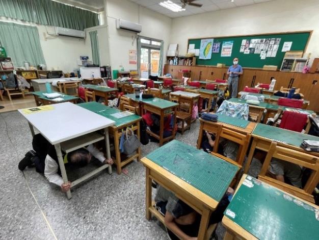 另外在吉姆幼兒園的宣導活動中,公所團隊特別針對幼兒園小朋友年齡特性,設計簡單易懂、趣味性高的防災教育宣導。活動首先介紹防災背包的重要性,利用圖卡向孩子們展示背包中應備的必需品,包括礦泉水、乾糧、手電筒、電池、哨子及簡易藥品等,並強調這些物品在災害發生時能保護自身安全與維持基本生活所需。透過互動式提問,讓孩子們猜猜背包裡還能放哪些東西?小朋友興奮地舉手回答,同時也展現出園方平時用心對於防災教育的落實,現場氣氛活潑熱絡。最後以實際演練方式帶領小朋友練習「地震保命三步驟」——趴下、掩護、穩住,讓孩子熟悉地震發生時的正確應變方法,演練中也特別強調保護頭部及身體的重要性,讓幼兒明白不僅要懂得保護自己,更要保持冷靜。