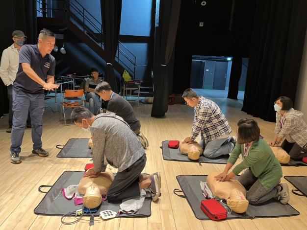 在實作課程方面,由消防局EMTP教官群為參訓學員進行基礎急救訓練、急救措施實作,包括簡易包紮技巧、傷患搬運處理、異物哽塞處理(哈姆立克法)及心肺復甦術(CPR)與自動體外電擊去顫器(AED)操作,教官說明面對不同緊急狀況該如何急救的作法,特別強調「用力壓、快快壓、胸回彈、莫中斷」心肺復甦術操作口訣,在急救術科測驗-CPR實作,連結電腦的操作測試,直接驗證學員CPR實作按壓速度及力道是否合格,讓學員能學習正確、有效的CPR操作技巧。