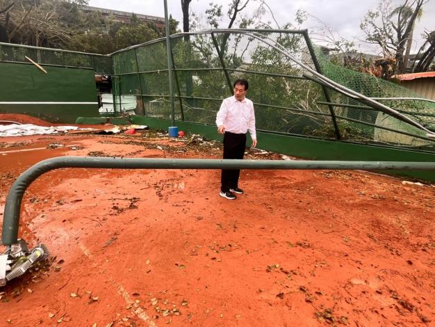 此次勘查範圍包括施工中的七股壘球場,以及篤加國小、北門國小、北門國中、蚵寮國小、學甲東陽國小、綜合體育館、新營體育場、壘球場及後壁國中高中軟式網球場等多處校園體育設施。陳局長指出,本次風災造成多數場地淹水未退,部分設施毀損情形嚴重,包括大型防護圍網倒塌、風雨球場屋頂破裂、網球場紅土流失等,情況令人憂心。