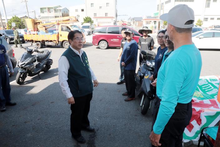 台南市長黃偉哲今(17)日上午再度前往北門區,視察丹娜絲颱風災後復原情況並關心居民生活。他也帶來豆花慰勞現場人員,向投入救災與重建的義消、替代役和國軍表達感謝。