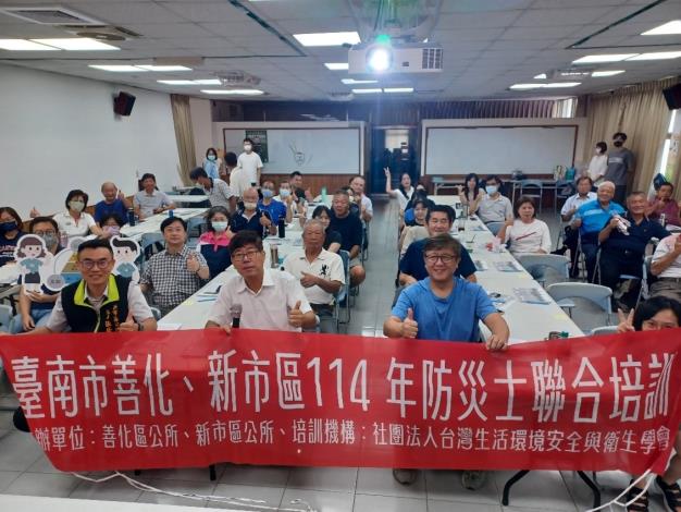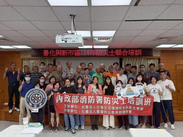 為配合內政部落實總統「全社會防衛韌性」理念,積極推動里長、里幹事全數取得防災士認證,善化區公所特別與簽訂區域聯防的新市區公所攜手合作,於114年8月28、29兩日,於善化區公所3樓會議室辦理「114年防災士聯合培訓」,委請社團法人台灣生活環境安全與衛生學會進行教育訓練。善化區長譚乃澄與新市區長張榮哲均親自率領公所同仁及轄內里長、里幹事一同出席參訓,而社區發展協會成員也應邀前來共襄盛舉,共計有52人與會。期待透過本次訓練,提升基層防災人員素質,並拓展救災人力,為地方防災網絡注入堅實動能。