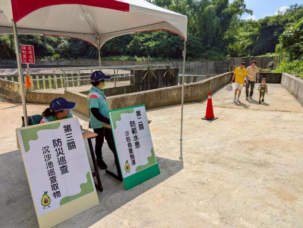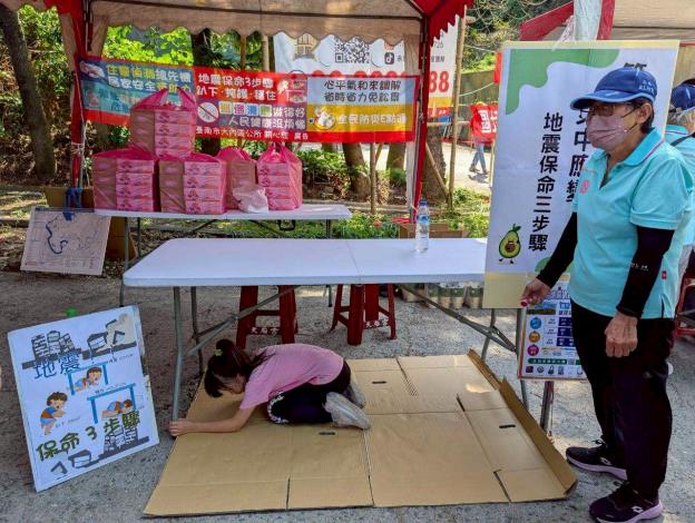 活動現場吸引不少民眾參與,父母親們大手牽小手帶著年幼兒女參加,家庭一起響應,幼兒園小朋友也跟著爸爸,雙手捉起5公斤的砂包,認識緊急避難背包要帶什麼?遇地震時,熟練的做出保命三步驟(趴下‧掩護‧穩住)的動作,體驗社區志工爺爺奶奶平時巡查沉砂池的工作,守護沉砂池體及避免落葉堵住排水,組裝防水擋板阻擋水流滿溢進入住家,下雨過後的復原工作(巡‧倒‧清‧刷)防制病媒蚊,賣力完成任務。
