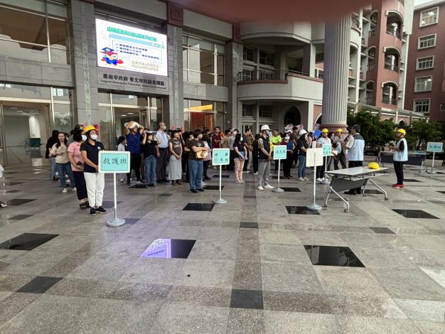 本次國家防災日地震演練,永華及民治市政中心已率先於9月18日(星期四)下午3點30分同步舉行。曾文市政中心(曾文市政願景園區)則首度於昨日下午3點30分,於園區現場模擬強烈地震發生,參演同仁立即執行「趴下、掩護、穩住」抗震保命三步驟。隨後,在工作人員引導下,迅速疏散至戶外安全區域,並進行人員清點與傷患初步救護演練,過程逼真且流暢,展現市府同仁面對突發狀況的應變能力。