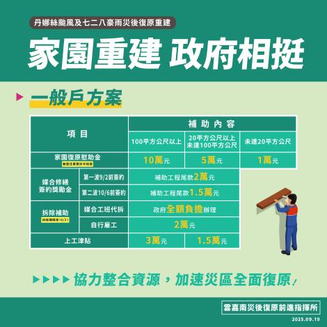 另依據行政院雲嘉南災後復原前進指揮所於9月公布的第2波媒合修繕簽約獎勵金,只要在中秋節(10/06)前完成媒合簽約,完工時即獲得1.5萬元工程尾款獎勵金,市府籲請受災戶把握機會。