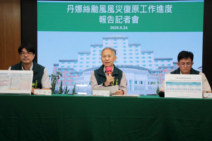 台南市政府今(24)日上午於永華市政中心召開「丹娜絲颱風災後復原進度記者會」,由秘書長尤天厚主持,針對屋損修繕、拆除媒合進度及慰助金發放、農損補助核撥狀況,邀集工務局、農業局及相關單位說明最新進度。