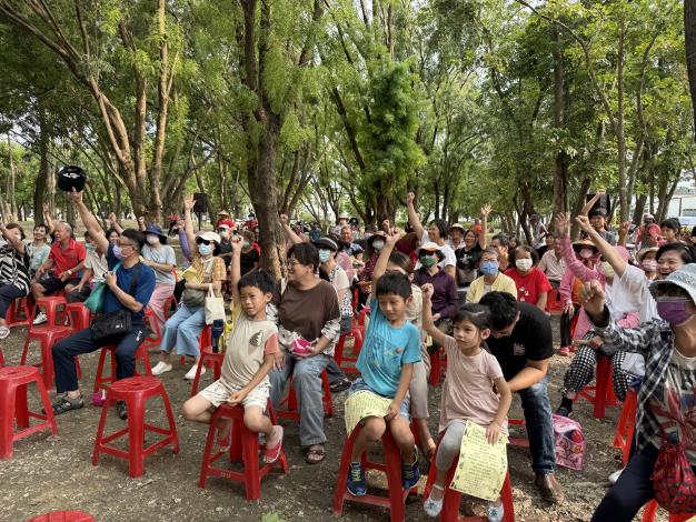 活動一開始便由「登革熱有獎徵答」揭開序幕,現場大小朋友爭相搶答,氣氛熱絡。透過問答方式提醒民眾要落實防蚊滅蚊四招「巡、倒、清、刷」,定期檢查家中內外環境並清除積水容器,降低病媒蚊孳生風險。市長夫人劉育菁老師也代表黃偉哲市長親臨會場,與大家同樂,並貼心協助發送「乖乖」點心,象徵祈求未來一切平安順利、好運連連。