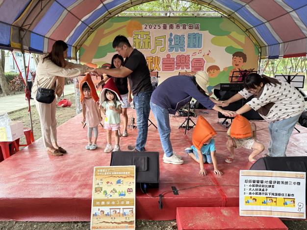值得一提的是,活動舉辦次日(9月21日)正逢國家防災日,區公所特別結合活動安排防災宣導,推廣颱風及地震避難知識與技能。現場設計親子互動演練,讓小朋友實際體驗「趴下、掩護、穩住」的地震避難動作:小朋友戴上防震頭套後,由家長扮演桌子,小朋友則躲入桌下並握緊桌腳完成演練。寓教於樂的方式深受親子喜愛,孩童不僅能將防震頭套帶回家實際應用,也從中學習到防震自保的觀念。區公所也呼籲民眾踴躍參加「全民地震網路避難動作演練」,只要上網至國家防災日活動專區(https://reurl.cc/GNgDGv)完成登錄及關卡挑戰,就有機會抽大獎,希望藉由線上與實體演練相結合,讓全民共同養成正確防災習慣。
