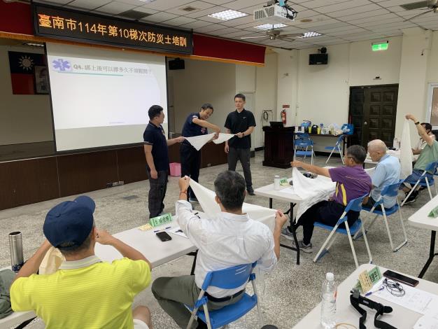培訓期間由消防局安排臺南市防災士協會理事長侯俊彥、臺南市政府消防局科長吳獻宗及消防局黃聖峰、楊家宗、蘇兆民等多位教官擔任講師,進行防災士相關課程說明及救護技能教學,講師並透過個人之工作經驗案例與學員分享,引領學員們認識「防災士」的角色對區里防災工作的重要與必要,並能學習簡易自救、包紮及CPR+AED操作技能,透過防災士的參與及運用,成為個人自助、社區互助的支撐關鍵力量,有效因應初級災害問題及處置,再行結合公部門力量投入,紮根區里防救災韌性,提升里長、里幹事及志工防災知能,期能降低災害損傷、協力災後復原。