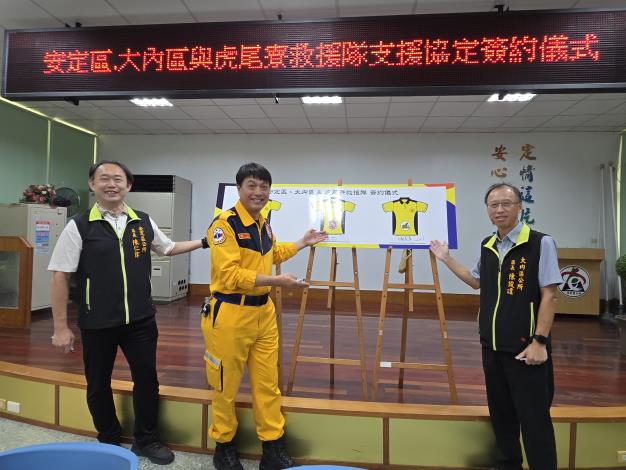 大內區與安定區114年10月1日上午於安定區公所3樓辦理與虎尾寮緊急救援隊簽立災害防救相互支援協定儀式,臺南市虎尾寮緊急救援隊2010年成軍,是支非屬義消系統的消防志工組織,救援隊長黃英慈分享隊員們擁有溯溪教練、急流救生、防災士、EMT救護、無線電、IRB救生艇駕駛……等多種專業證照,遇到請求支援時能即時前支援,是一支實力堅強的民間救難隊伍。