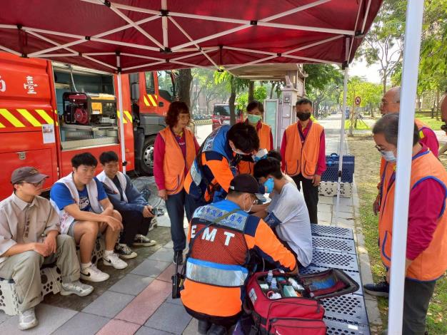其中,區公所的角色更加明確而積極。啟動東區的「韌性社區協力機制」,不只是動員社區與里辦公處配合,而是主動作為後端支援的策略中心。此次演練中,區公所規劃並設定了後勤照護站,提供休息空間、水分補給、降溫設備與生命徵象監測(R.E.H.A.B),支撐第一線消防人員的安全與體力。化學災害現場的風險往往在看不見的地方,而第一線同仁若因高熱、缺水或生理負荷而倒下,再好的戰力也無法持續。因此,我們把照護站視為任務鏈中的關鍵節點,只要消防能安心衝鋒,後端就必須成為他們最穩固的後盾。