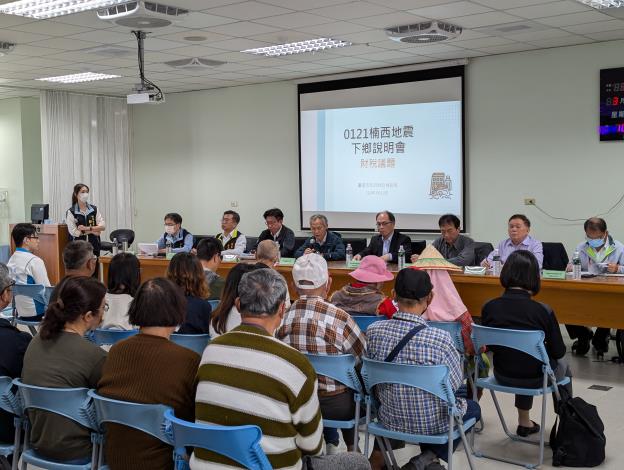 臺南市長黃偉哲為協助0121地震受影響市民了解相關稅金減免、公有土地協助措施及公股銀行低利貸款等財稅議題,臺南市政府於3月10日分別在玉井、楠西及南化區公所召開3場下鄉說明會,逐一詳細解答民眾所提疑問,以協助市民儘速重建家園。
