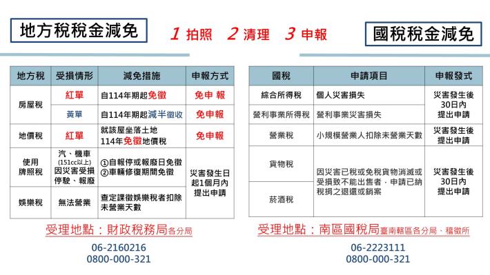 針對紅黃單稅金減免議題,財稅局進一步說明,受 0121地震影響,經核定「紅單」之房屋自114 年起免徵房屋稅,及其土地免徵地價稅,由財稅局主動辦理減免,倘拆除房屋,自拆除當月起註銷稅籍,免徵房屋稅;「黃單」之房屋自114年起減半徵收房屋稅,另未設立戶籍不影響房屋稅減免權益。
