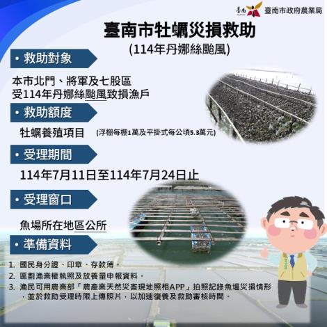 臺南市於7月6日、7月7日間受中度颱風丹娜絲侵襲,超強陣風與颱風潮流侵襲海岸,重創本市主要養殖漁業及漁港區域漁船筏,造成嚴重災損,農業部依據災情評估結果,認定已達天然災害救助標準,並於7月10日公告新增七股區在漁港區域漁船筏,及北門區、將軍區、七股區牡蠣養殖為漁業天然災害現金救助及低利貸款地區。