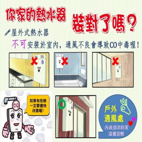 東北季風增強,天氣漸漸轉冷,氣溫下降,大家習慣緊閉門窗,但是家裡的瓦斯熱水器如果安裝錯誤,就有可能在洗熱水澡時造成一氧化碳中毒事件。提醒大家,使用瓦斯熱水器時,有頭暈、頭痛、噁心、嘔吐、全身無力等症狀,要警覺可能是一氧化碳中毒,請採取下列步驟:立即停止使用熱水器。打開窗戶通風,移到室外通風、安全處。身體不適請撥打119救助。最後,別忘了要盡快改善熱水器
