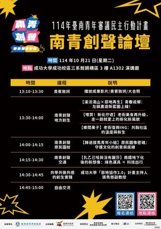 一、本府為推動青年公共參與,辦理「臺南青年審議民主行動計畫」對外徵件,由青年組隊提案辦理如公民咖啡館或願景工作坊等審議討論活動,入選五組青年團隊於今年8至9月辦理審議工作坊。論壇中青年團隊將發表在地審議成果,搭建青年團隊發聲舞台,展現青年對地方議題的創新解方與公共參與的影響力,以地方實踐案例開啟青年與政策的對話大門。