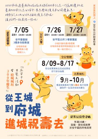 為推動參與式預算與公民審議制度,安平區公所今年以「從王城到府城:進城祝壽去」為主題,響應臺南府城城垣建成300週年,邀請市民一起提出創意、共同決策。歷經7/26-27兩場公民大會熱烈討論,產出8項在地提案,即將透過全民票選出最具代表性的計畫,由公所實地執行、共襄盛舉!