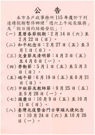 本市各戶政事務所於上開連續假期暫停週六上午延長服務及預約結婚登記服務。