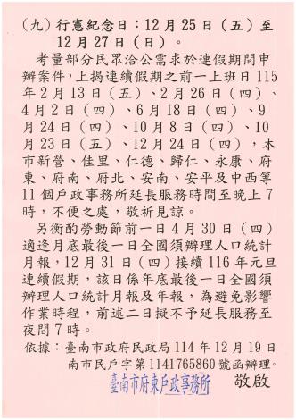 二、本市有實施週六上午延長服務之戶政事務所辦公處(新營、佳里、仁德、歸仁、永康、府東、府南、府北、安南、安平及中西)於連續假期之前一上班日,包含115年2月13日(星期五)、2月26日(星期四)、4月2日(星期四)、6月18日(星期四)、9月24日(星期四)、10月8日(星期四)、10月23日(星期五)、12月24日(星期四),延長服務時間至夜間7時。