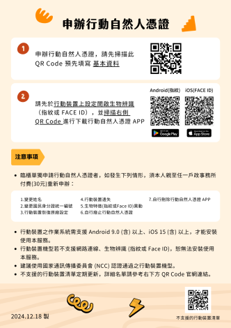 內政部為使民眾知悉臨櫃申辦行動自然人憑證流程及相關注意事項宣導訊息。