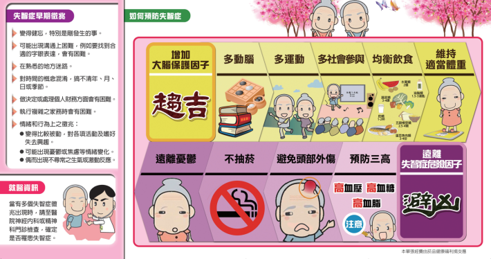目前還沒有任何藥物可以治癒失智症,因此如何預防失智症就成為大眾關心的議題,民眾應積極在生活中增加大腦保護因子(趨吉),同時減少危險因子(避凶),以降低罹患失智症的風險,甚至預防失智症的發生。