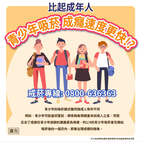 菸品對於青少年健康會帶來許多危害,會造成或加重氣喘、支氣管炎等呼吸道疾病外,國民健康署署提醒,家長平時應多關心孩子的作息與零用錢使用狀況,並以自身不吸菸為榜樣,營造拒菸、無菸的環境。孩子會開始吸菸的原因並不是單一因素所造成的,可能是無聊好奇、朋友邀約、處於吸菸環境、或紓壓等,若發現孩子接觸菸品甚至是電子煙,父母應以關懷代替責罵,及早為孩子尋求專業戒菸服務並帶其遠離菸害。