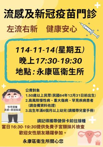114年永康衛生所流感/新冠/長者肺鏈疫苗門診時間