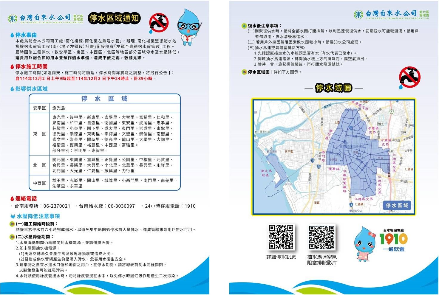 自來水公司為管線工程所需,臺南市(含中西區)共18行政區(永康區、安平區、東區、中西區、北區、玉井區、南化區、安定區、新化區、左鎮區、善化區、大內區、山上區、新市區、歸仁區、關廟區、龍崎區、仁德區),於114年12月2日起停水、壓降供水39小時