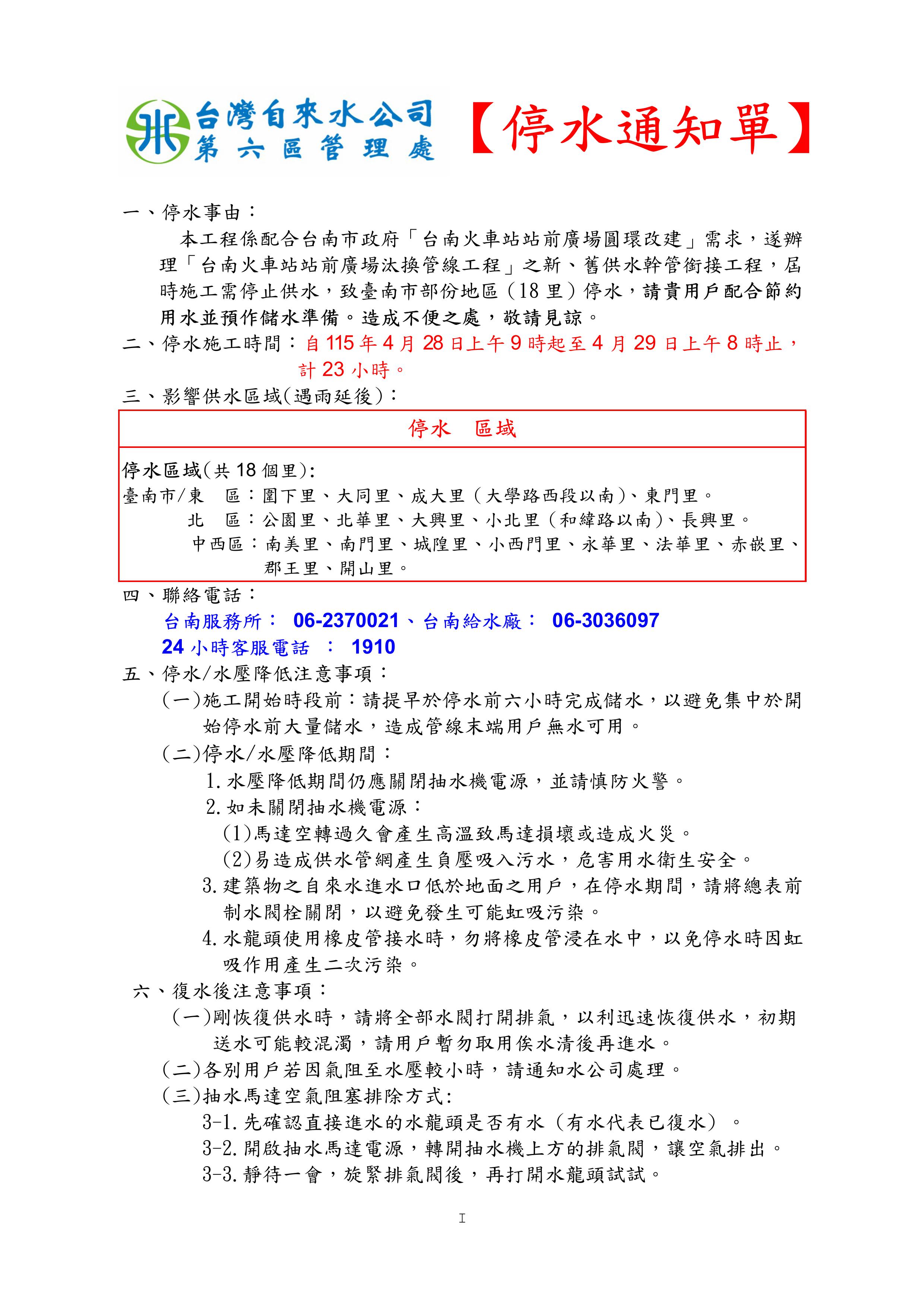 停水詳情請見自來水公司通知單、或撥打台南服務所06-2370021電話、或撥打自來水24小時客服專線1910、或查詢網站https://web.water.gov.tw/wateroffmap/map/view/202604210028