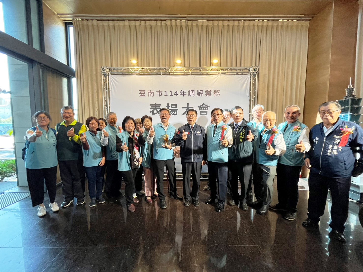 大會中同時表揚榮獲113年台南市各區調解行政績效考核團體獎-甲組:第一名:東區區公所;第二名:安南區公所;第三名:永康區公所;第四名:中西區 公所;第五名:北區公所;團體獎-乙組:第一名:官田區公所;第二名:白河區公所;第三名:七股區公所;第四名:安定區公所;第五名:鹽水區公所。
