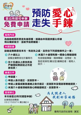 防走失愛心手錬設籍並實際居住於臺南市之60歲以上長者、55歲以上原住民(含户籍熟註記之市定原住民)、未滿60歲領有第一類身障證明者,如有走失之虞,家屬可免費向臺南市各區公所申辦愛心手錬配戴,以降低家人走失風險。完整資訊請參見臺南市政府社會局網頁https://tinyurl.com/25pcttnk(首頁/老人福利/長者福利與服務/獨居服務/預防走失-愛心手鍊)