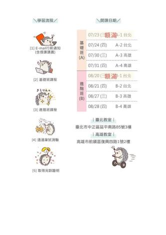 課程自7月起開設基礎班4梯次,8月接續進階班4梯次;凡完成基礎與進階班課程各1梯次,並通過測驗者,將獲頒三單位聯名之【完訓證明】。