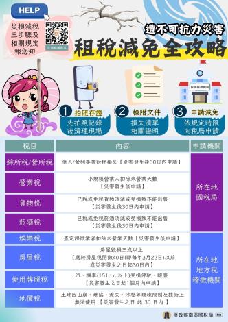 稅捐稽徵機關協助災民申辦減免,國稅局專線0800-000-321321。
