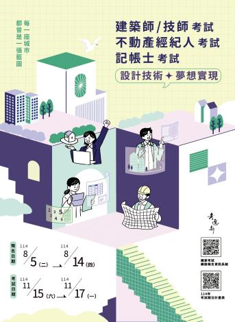 114年專門職業及技術人員高等考試建築師、25類科技師(含第二次食品技師)、大地工程技師考試分階段考試(第二階段考試)暨普通考試不動產經紀人、記帳士考試開始報名,報名期間114年8月5日至14日止。