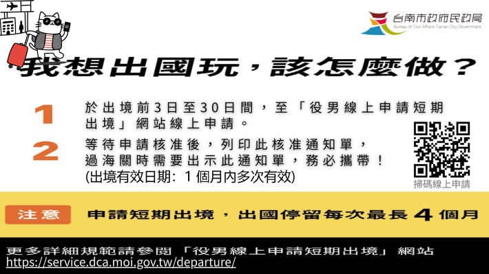 內政部役政司已建置「役男短期出境線上申請系統」(https://service.dca.moi.gov.tw/departure/),受理役男短期出境之線上申請,欲出國之役男,請儘早於出國日前3至30天之內完成出境申請,經查核無管制情形者,將立即獲核准出境,於列印核准通知單後,自核准當日起1個月內(含核准出境有效日期的最後一天)可多次使用通關出境,出境最長不可超過4個月。