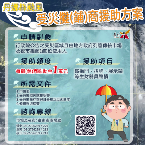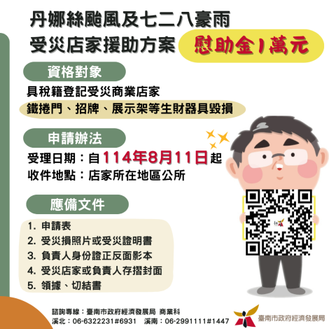 經發局指出,本次慰助方案適用於具稅籍登記之商業店家,因災害造成鐵捲門、招牌、展示架等生財器具毀損者,每家可獲得1萬元慰助金。店家送件時須檢附申請表、受災照片或受災證明、負責人身分證影本、店家或負責人存摺封面、領據及切結書等文件,相關資訊可上經發局官網 (https://economic.tainan.gov.tw/cp.aspx?n=45442) 查詢。