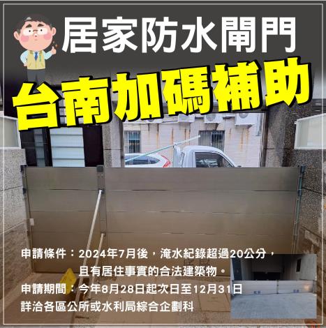 本次補充公告重點補助對象為113年7月後有淹水紀錄超過20公分,且有居住事實之合法建築物之住家均得申請補助,申請期間自補充公告日114年8月28日起次日至114年12月31日,補助經費額滿為止,且每案最多可申請2處,設置材質仍應為鋁合金或不鏽鋼,每處依實際設置出入口寬度及設置高度計算,新補助標準詳可參考臺南市政府水利局官網之補充公告為主,申請人仍可至建物所在區公所申請補助,有關「臺南市政府鼓勵建置防水閘門(板)114年度專案補助計畫」及詳細資訊已刊載於市府水利局官網,有相關問題者歡迎洽詢各區區公所或水利局綜合企劃科。