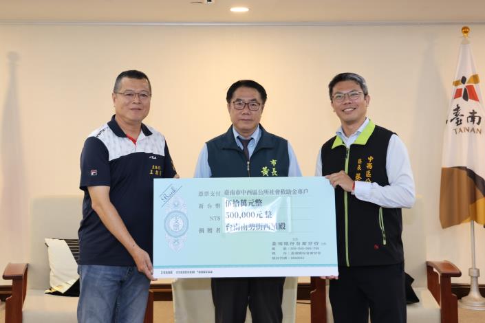 台南近日受丹娜絲風災重創,南勢街西羅殿今(2)日捐贈新臺幣250萬元予市府、50萬予中西區公所,協助災區加速復原。市長黃偉哲代表受贈並回贈感謝狀及伴手禮,感謝地方信仰團體伸出援手,善心義舉令人感動。