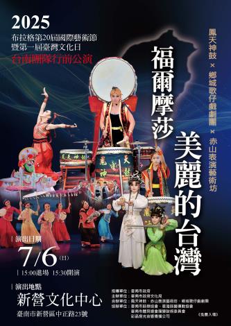 為展現臺灣文化的深度與廣度,並向國際傳遞島嶼上的藝術風華,由「臺灣─捷克藝術文化交流協會」(Taiwan–Czech Arts & Culture Exchange Association,TcAcI)邀請臺灣共7個團隊參與今年7月15日登場的《2025年捷克布拉格國際藝術節20週年暨布拉格第一屆臺灣文化日》盛會,臺南團隊包含赤山表演藝術坊、鳳天神鼓、鄉城歌仔戲劇團。