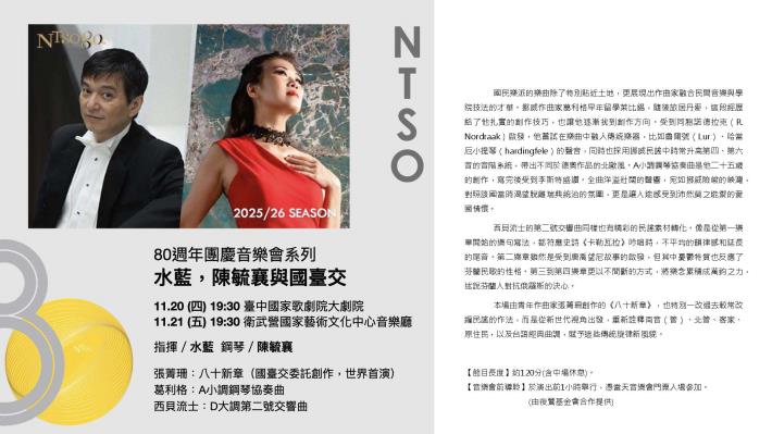 3、NTSO 80週年團慶音樂會系列─水藍,陳毓襄與國臺交:114年11月20日(四)19:30臺中國家歌劇院大劇院、114年11月21日(五)19:30衛武營國家藝術文化中心音樂廳。