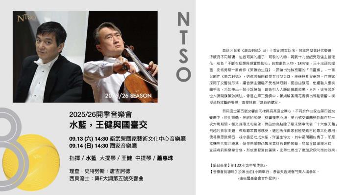 1、NTSO 2025/26開季音樂會─水藍,王健與國臺交:114年9月13日(六)14:30衛武營國家藝術文化中心音樂廳、114年9月14日(日)14:30國家音樂廳。