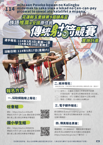 3、電子郵件報名: 請寄報名表資料至atsu0710@hlyl.gov.tw,來信主旨標明「報名原住民傳統射箭賽-OOO組」。